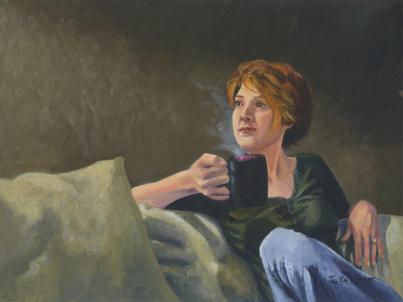 It seams like I have gone from a year long dry spell to an oasis of ideas. Working on several pieces at a time. This painting was so much fun and yet so much of a challenge. I wanted to do her with a loose brush stroke to give it a relaxed feeling as the pose is of my daughter Jenny relaxing and with me and a cup of hot chocolate. As I often do as I am talking to someone I think of how I would mix the colors to paint her face or the color of reflected light that catches her chin. Then I was struck by her relaxed pose and did the mom thing and pulled out my phone and snapped a few quick shots before she realized I was doing so.