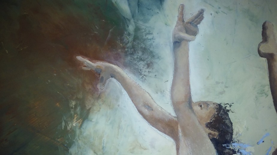 Here you can see the rough edges around the subject. I think it adds interest to the piece. Anyway as I finished up with the skin tones I realized that this was not a gymnast but a dancer. I’m the artist I can make these kind of decisions! LOL! She needed a pretty flowing dress and some point shoes. What do you think?