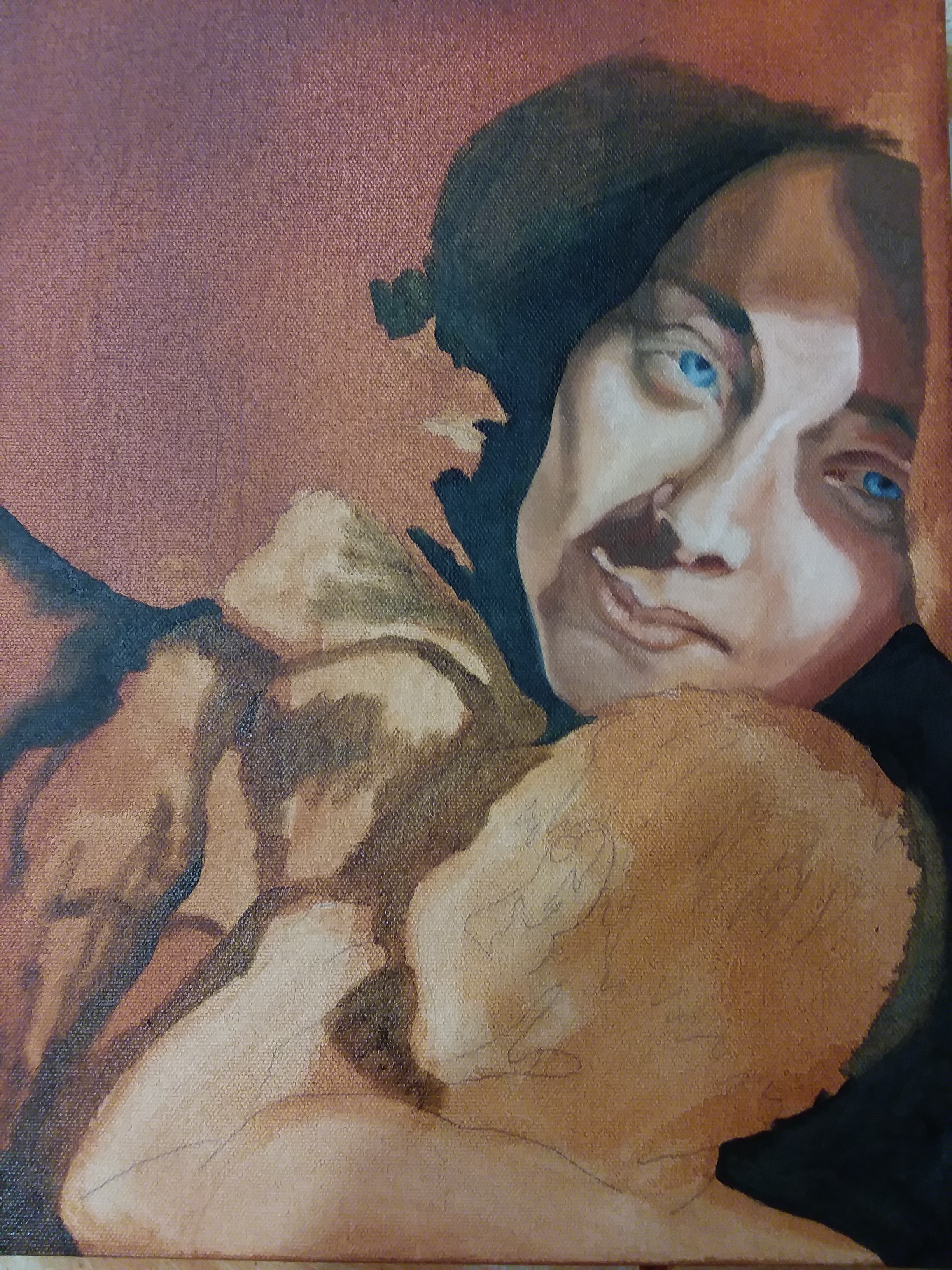 This Mother and Child Figurative painting is the second in my Motherhood series. This painting reflex the sleepless nights and the selfless sacrifice of a mother to do what is needed for the the child to have peace and be able to sleep, even if that means she stay awake. I was drawn to the beauty in the the exhausted eyes depicting not only her tiredness but also a relaxed peace that at least finally her child has found rest.