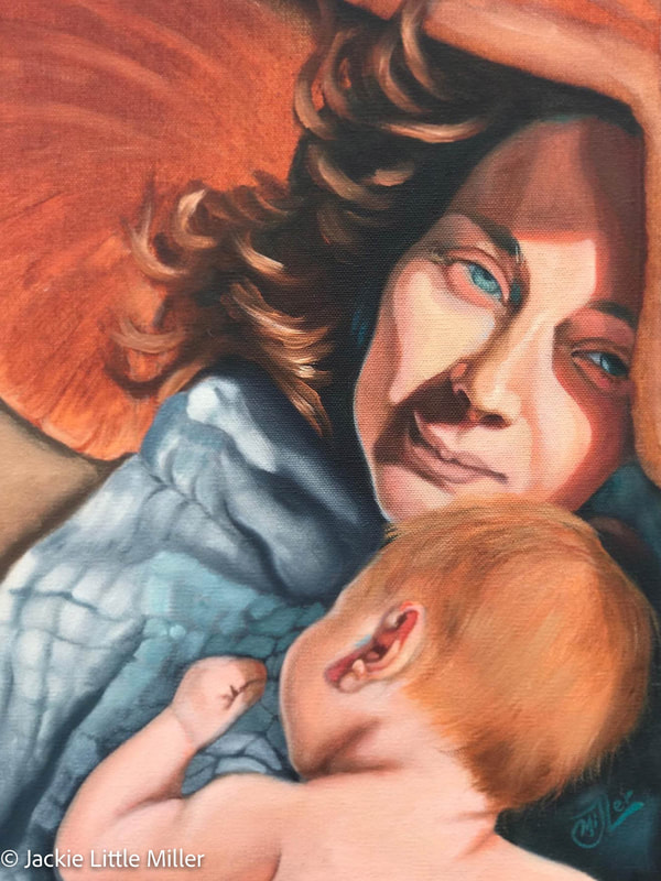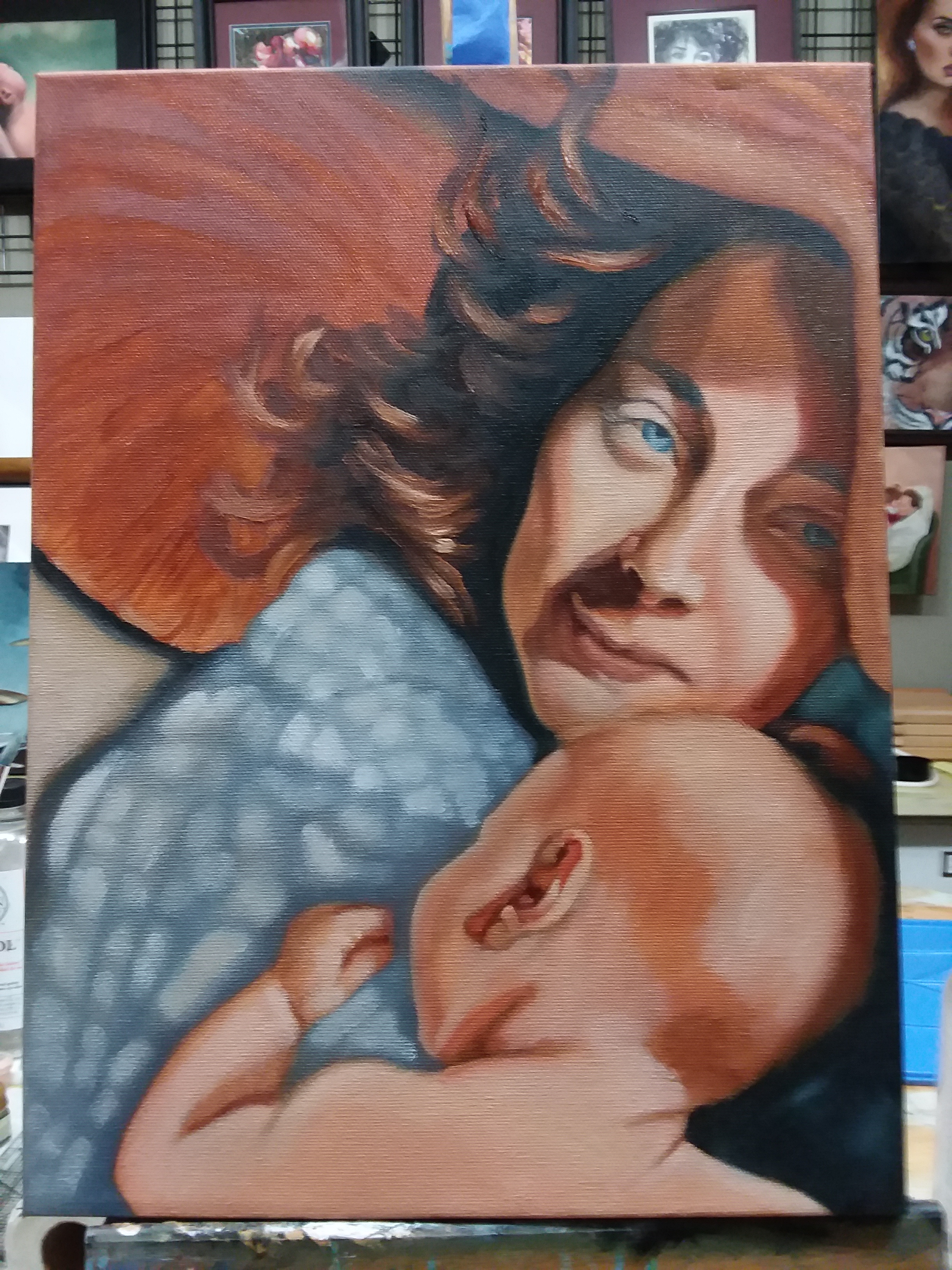 As always I start by drawing the image out onto my canvas. With this series I have pre-toned the canvas with a thin coat of transparent Iron oxide. This is such a vibrant color and adds such a glow to the background and even shines thought the layers of paint that go over it, giving the painting a warmth that expresses motherhood perfectly.